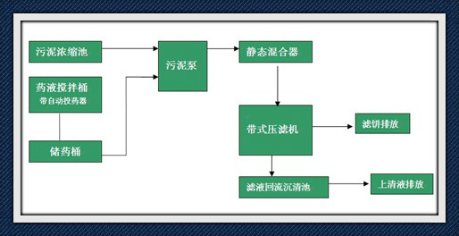 原始污水在經(jīng)過生物化等工藝處理后,再經(jīng)過沉淀、濃縮,一部分水成為清液排出,原來的污水形成較高濃縮度的污泥,以達到帶式壓濾機的最佳工作條件。