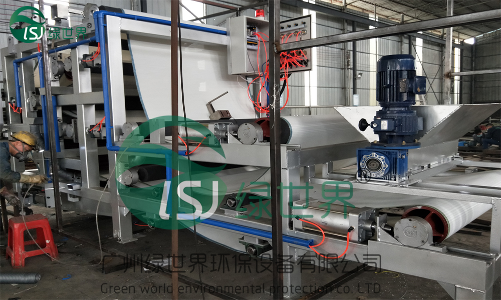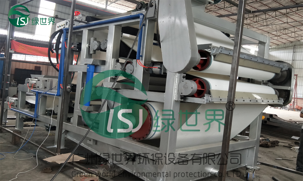 經(jīng)過沉淀的污泥在與一定的濃度的絮凝劑在靜、動(dòng)態(tài)混合器中充分混合以后再污泥中的微小固體顆粒凝聚成體積較大的絮狀團(tuán)塊,同時(shí)分離出自由水,絮凝后的污泥被輸送大重力脫水是濾帶上,在重力的作用下自由水被分離,形成不流動(dòng)狀態(tài)的污泥。然后夾持在上下兩條網(wǎng)帶之間,經(jīng)過過預(yù)壓區(qū),低壓區(qū)和高壓區(qū)由小到大的擠壓力,剪切力的作用下,進(jìn)一步擠壓污泥,達(dá)到最大的程度的泥、水分離,最后形成濾餅排出。